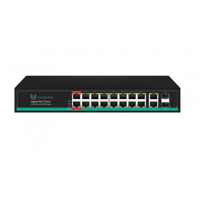 Гигабитный неуправляемый коммутатор Unibrave с 16 PoE-портами 10/100/1000 Мбит/с, 2 Uplink-портами 10/100/1000 Мбит/с RJ45, 2 SFP-портами 1000 M.